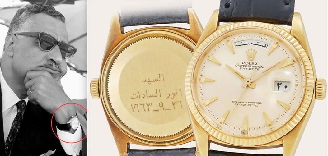 Το ρολόι αυτό ήταν ένα πολύτιμο δώρο από τον καρδιακό του φίλο Ανουάρ Ελ Σαντάτ, ο οποίος θα διαδεχόταν τον Νάσερ ως τρίτος πρόεδρος της Αιγύπτου. Μάλιστα, στο πίσω μέρος του είχε την επιγραφή στα αραβικά : ¨Κύριος Ανουάρ Ελ Σαντάτ 26-9-1963¨, η οποία σηματοδοτούσε το δεσμό μεταξύ των δύο ηγετών και φίλων.Το Rolex Day-Date, που παρουσιάστηκε αρχικά το 1956, είναι το κορυφαίο μοντέλο του καταλόγου Rolex, κατασκευασμένο αποκλειστικά από πολύτιμα μέταλλα και γνωστό ως το πρώτο ρολόι που εμφάνιζε πλήρως την ημέρα και την ημερομηνία στο καντράν. Συχνά αναφερόμενο ως Rolex President, αυτό το ρολόι είναι συνώνυμο με το κύρος και την εξουσία, και είναι αγαπημένο από ηγέτες της βιομηχανίας, διασημότητες και αρχηγούς κρατών.