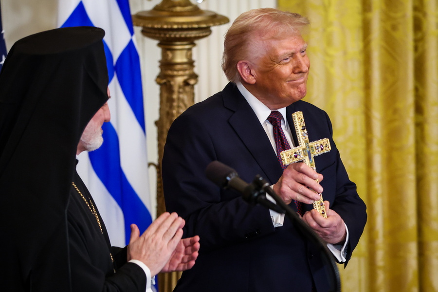 «Σας ευγνωμονούμε για τη στήριξή σας στην Ελλάδα και την δικαιοσύνη στην Κύπρο», είπε, εκτός των άλλων, ο Αρχιεπίσκοπος Ελπιδοφόρος και έκανε δώρο στον πρόεδρο έναν χρυσό σταυρό, λέγοντας: «Ο σταυρός είναι το σύμβολο της ειρήνης και με αυτό εύχομαι να φέρεις ειρήνη στον κόσμο και να κάνεις την Αμερική ανίκητη».